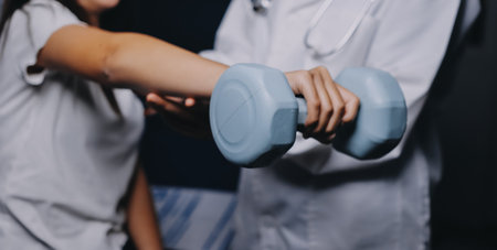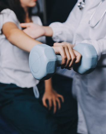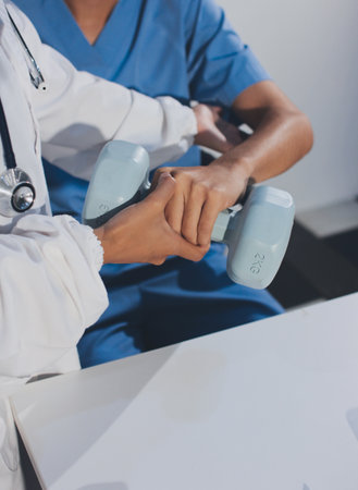 Close up doctor physiotherapist and nurse helping happy patient lift dumbbell with one hand. Healthcare industry