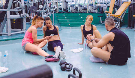 Young beautiful women looking the smartphone while a couple friends talking sitting on the floor of fitness center
