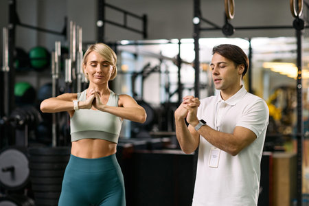 Caucasian young adult woman performing physical therapy exercise under supervision of Caucasian young adult man in rehabilitation gym, both focusing on hand and arm movement coordination