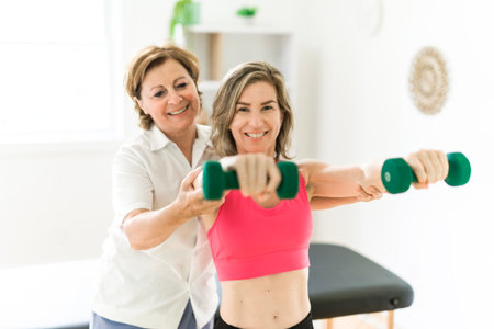 old woman training with physiotherapist using dumbbells at home therapist assisting senior woman with exercises in nursing home elderly patient using dumbbells with outstretched arms no logos no bran