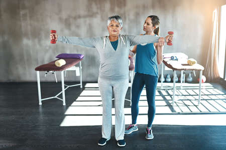 Staying strong in the senior years. a senior woman using weights with the help of a physical therapist.
