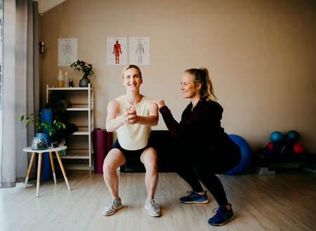 female patient holding squat position in exercise studio while physio therapist assists balance and alignment