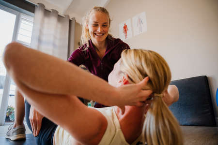 Female patient correcting crunch techniques with physio therapist in exercise studio