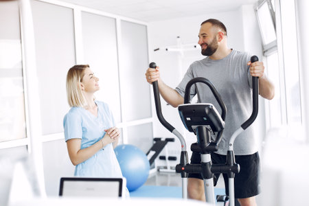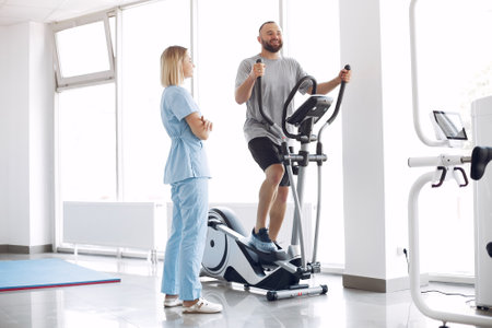 Male undergoing neuromuscular rehabilitation on modern equipment