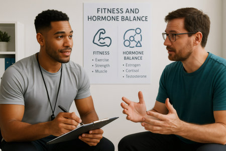 Fit man discussing workout plan with his trainer, personal coach before starting workout in the gym. Personal coach standing near young man and showing something on his clipboard