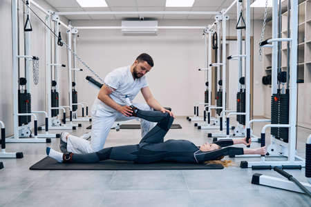 Cool down stretching after workout. Training with personal trainer, Physiotherapy, chiropractic adjustment
