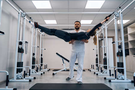 Young beautiful sportswoman having a strain and being stretched by trainer