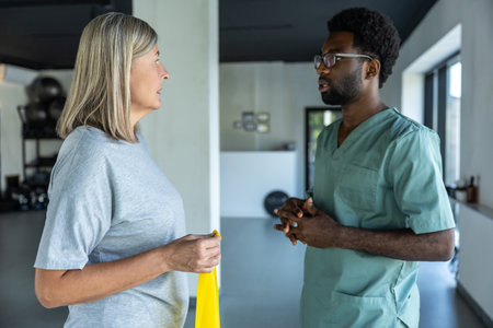 black rehabilitation woman physiotherapy at physio clinic with customer