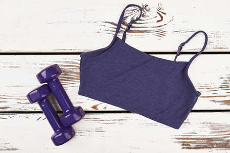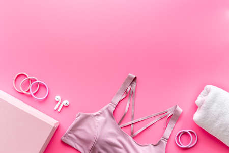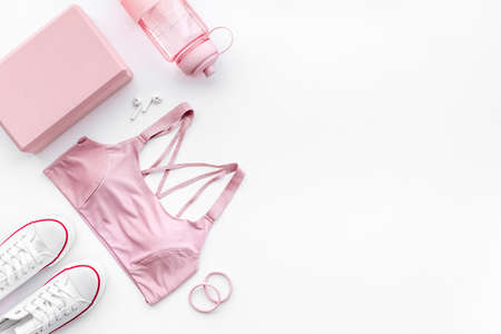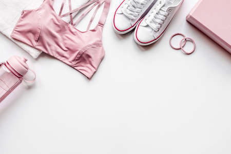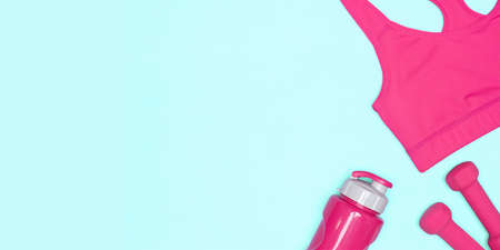 Fitness equipment. Woman workout accessories and clothes flat lay.