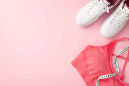 fitness concept. Top view photo of white sneakers pink sports bra and tape measure on isolated pastel pink background with copyspace