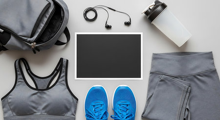 Women's sport wear, Gym fashion and accessories, Exercise Equipment, Healthy lifestyle concept, Shoes, Yoga Mat, Sport Bra.