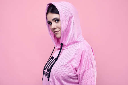 Portrait of a gorgeous body positive Latin woman in a pink sports hoodie posing on a vivid background in the studio