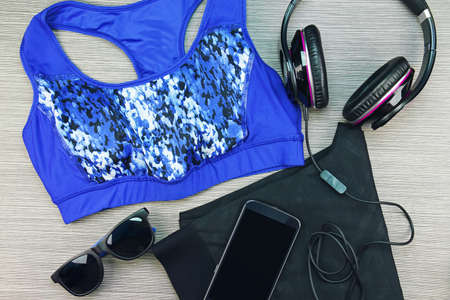 Women's sport wear, Gym fashion and accessories, Exercise Equipment, Healthy lifestyle concept, Sport bra, Headphone.