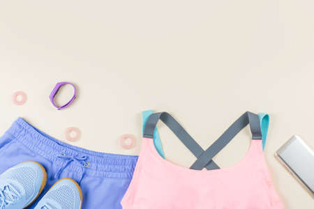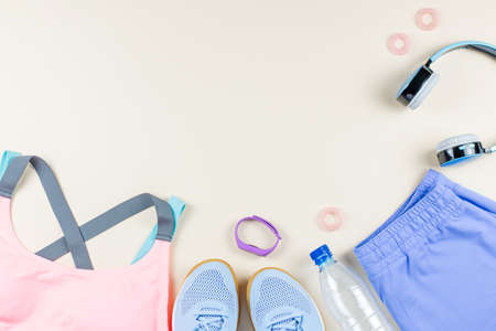 Woman sport clothes, sneakers, headphones and fitness tracker on neutral background. Sport fashion concept. Flat lay, top view