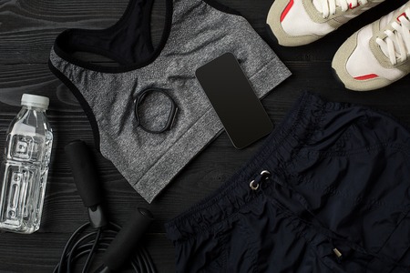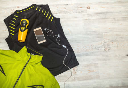 sportswear and earphones mobile-phone lifestyle flat lay overhead view. bottle,sportswear,sneakers and badminton racket on wooden background