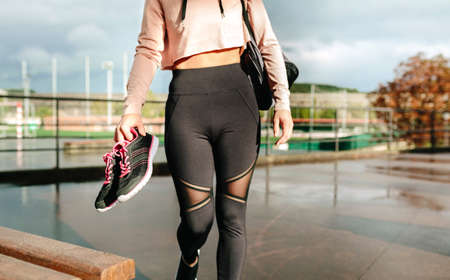 Unrecognizable young sportswoman with gym bag and sports shoes walking to go to training