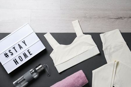 Stylish sportswear, yoga mat and light box with hashtag Stay at Home on white wooden background, flat lay. Self isolation during COVID‑19 pandemic