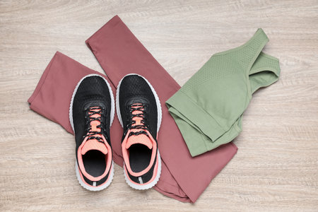 A flat lay of women's fitness apparel and accessories neatly arranged on a wooden floor. The set includes leggings, a sports bra, sneakers, a water bottle, and a smartwatch, representing a prepared and organized approach to a healthy and active lifestyle.