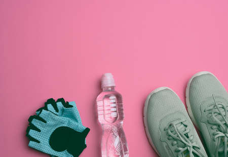 pair of sports sneakers and a bottle with mineral water on a pink background, top view, copy space