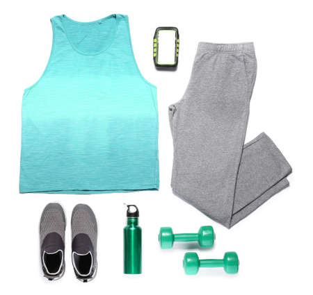 Flat lay composition of Sports equipment, clothes on white background. Fitness, sport and healthy lifestyle concept. top view