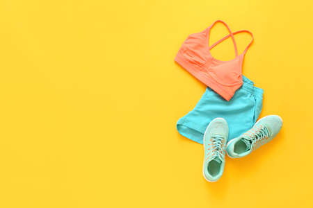 Layout of sport clothes and accessories for women with fruits on yellow background.