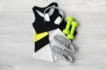 Sportswear, shoes, dumbbells and headphones on light wooden background