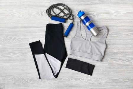 Sportswear, shoes, dumbbells and bottle for water on light wooden background