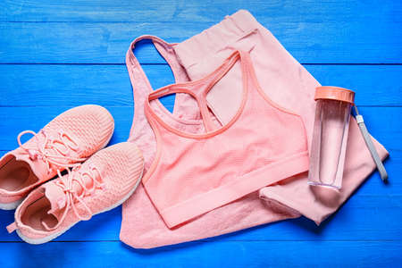pink women's sneakers and clothes for sports on a blue background, top view, copy space, flat lay