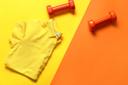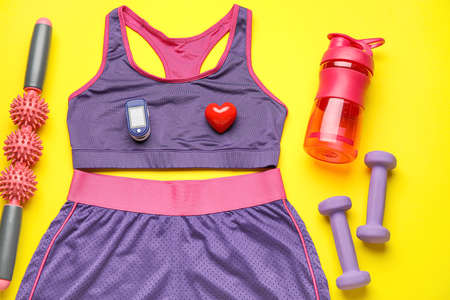 Sportswear, dumbbells, bottle of water, body roller, pulse oximeter and heart on color background, closeup