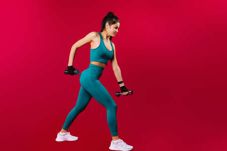 A full-length photo of a girl in sportswear during a fitness workout with dumbbells against a red background with side advertising space.