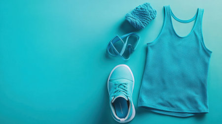 A vibrant turquoise athletic setup featuring a tank top, stylish sneakers, and fitness accessories, ideal for fitness enthusiasts looking for trendy workout apparel.