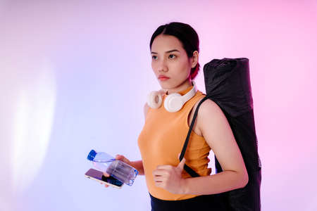 Portrait of confident beautiful asian fitness woman standing after exercise isolated on blue color banner background with copy space.Concept of slim and healthy happy girl workout.