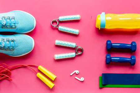 Flat lay composition sports and fitness accessories on colorful background. Ready for training. top view