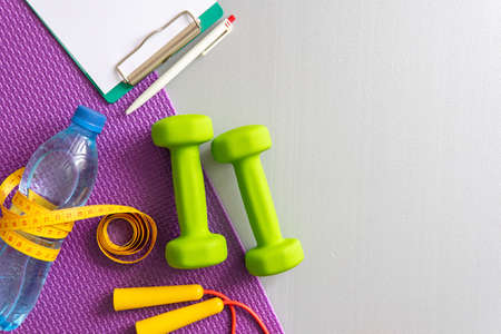 Sports background. Equipment for training. Fitness, workout at home. Flat lay, top view, copy space