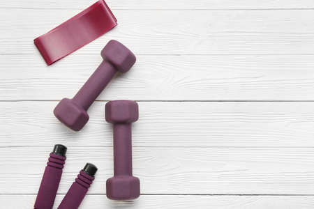 Stylish dumbbells, elastic band and skipping rope on light wooden background