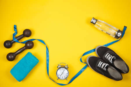 Sports background. Equipment for training. Fitness, workout at home. Flat lay, top view, copy space