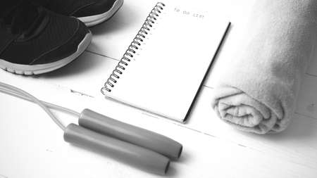 fitness equipment : running shoes,towel,jumping rope and notebook write to do list on white wood table black and white color tone style