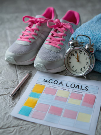 Fitness goals are being tracked using a progress chart, paired with sneakers and a clock. Ideal setup for motivational training at home or gym.