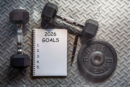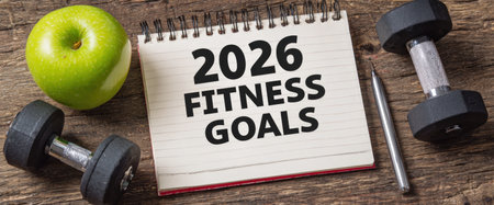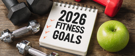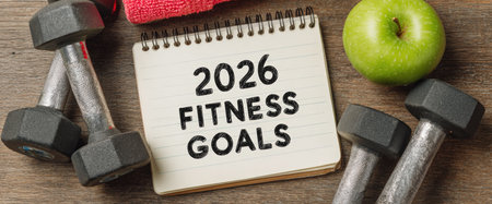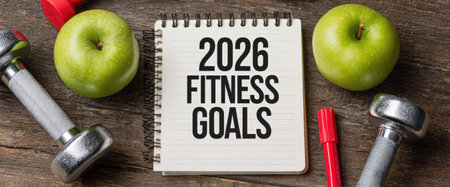 A notepad displays the words 2026 fitness goals next to a green apple and dumbbells on a wooden surface. This scene captures motivation and determination as the new year begins