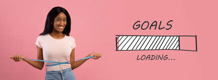 Slim black lady measuring waist, happy with slimming diet results over pink background, collage with goals loading bar