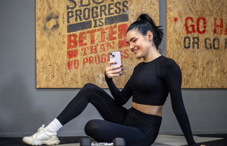 They deserve a little rest Beautiful young women in sportswear discussing something with smile and using smartphone while sitting on exercise mat at gym : Generative AI