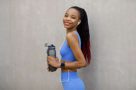 Shot of a beautiful female runner standing against a gray wall with a bottle of water resting after a workout.