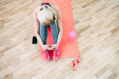 Happy girl sits on a foot mat after workout