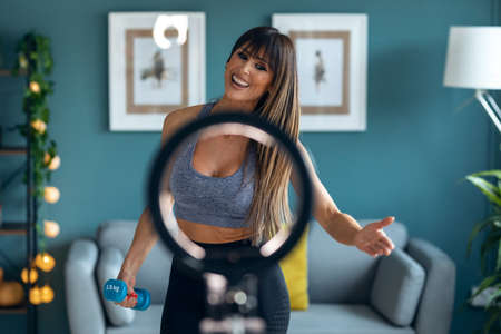 Shot of sporty mature woman blogger shooting fitness workout in the living room at home.
