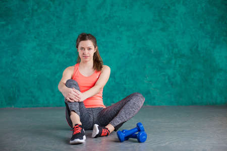 Sporty young woman sitting on floor in gym
