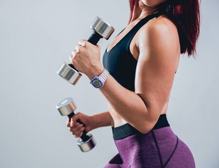 Sportive woman holding dumbbells. She's wearing sport clothes and having slim waist