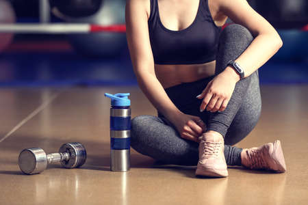 dumbbell and water bottle on the ground around the sport girl. woman's hands tying shoelaces on sport sneakers in gym.