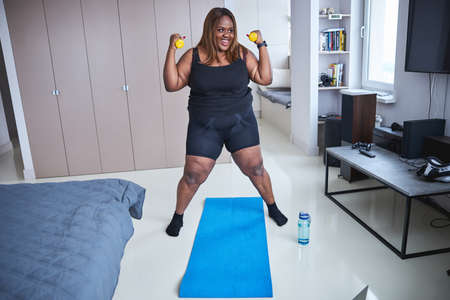 smiling african american plus size woman in sportswear exercising with dumbbells, banner