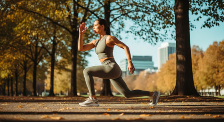 Training in park, woman prepares for running