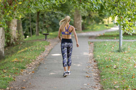 Beautiful young woman walking in the park at sunrise. Healthy lifestyle concept.